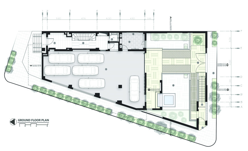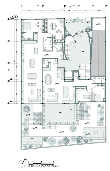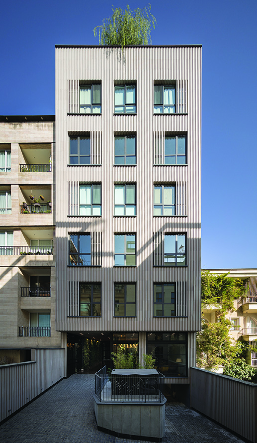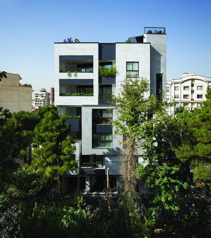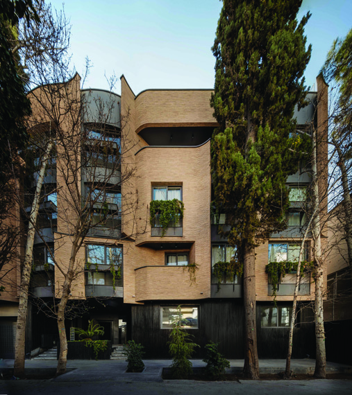 Located near Ghasrodasht gardens, the project asks: Can new construction revive some of the damage done to historic gardens? Cuts in the facade skin dynamically change according to tree positions, avoiding monotony and maximizing the physical and visual connection with the neighborhood. Organic forms flow from the facade into the lobby and interior plan. On the courtyard side, all old trees were preserved, creating a space rich with greenery.