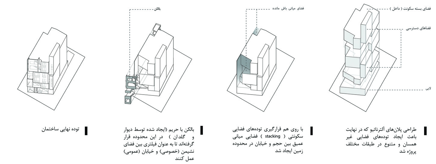 Ilam is one of the few cities where most buildings are built with 100% site coverage and high density. The project attempts to allow the building to take shape in the tension between object-oriented and field-oriented architectural discourse. Two skins were created so that semi-open spaces form active and livable roles between them, addressing privacy, visual comfort, and energy reduction through shadow theory and large openings.
