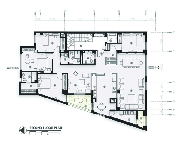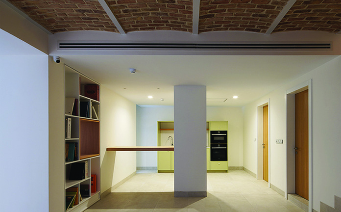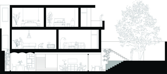 The central theme was connecting private interior living space with the public street. Instead of a rigid two-dimensional wall, the Sepiz building strengthens the idea of an in-between space. Alternative plans for floors and stacking creates a heterogeneous, deep intermediate zone. The living area directly interacts with the main intermediate space through full-length windows, while the southern facade incorporates a recess that eliminates the conventional internal light well.