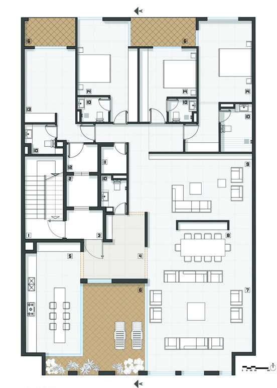 This building consists of two symmetrical blocks designed as a single unified volume. The L-shaped base module organizes interior spaces and enables varied combinations of duplex and single-unit arrangements. Through sliding and combining these modules, spatial diversity has been created. The terraces function as cuts in the volume and, by controlling light and shadow, provide climatic comfort in the hot and humid conditions of Kish.