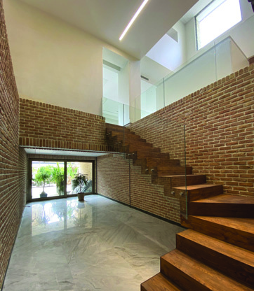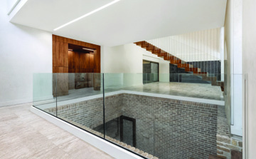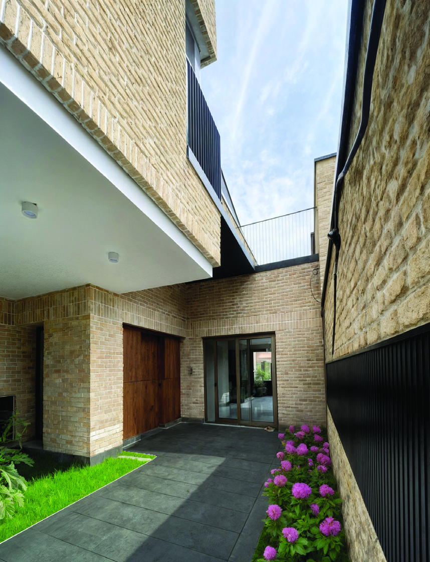 The intermediary brick space, like the beating heart of the home, brings together the kitchen, living room, hashti, and entrance in an integrated connection through operable glass walls. To distinguish this intermediary space and evoke a sense of authentic life, handmade bricks were used — creating a fundamental contrast between the building's exterior facade and the interior. This space is a contemporary redefinition of the role of open space in daily life, establishing a link between modern architecture and the memories of traditional Iranian homes.