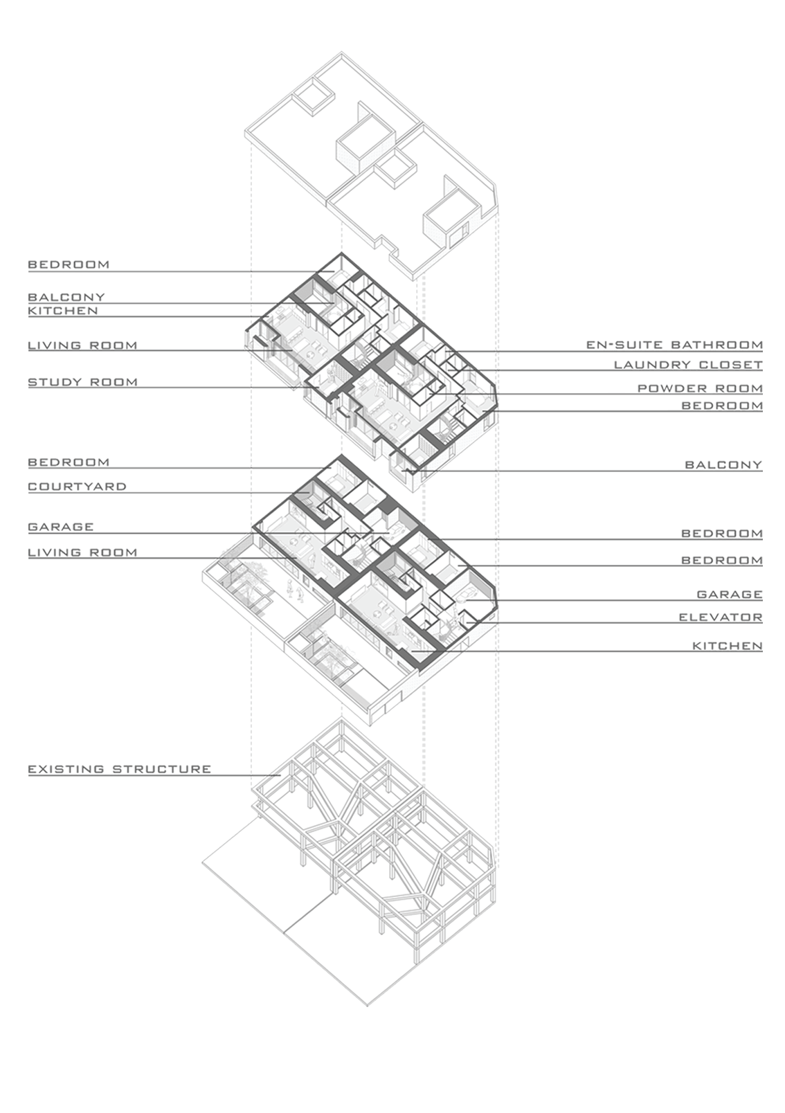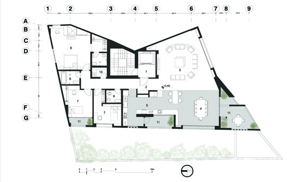 The commission began with a "triple" contradictory request from the client, who needed an apartment for himself, his son, and his daughter, emphasizing that two or three decades ago they had lived in semi-detached courtyard houses. Three important features were identified: the highly irregular geometry of the site with corners at various angles, a linear forest park opposite the project, and three-generation "neighborliness."