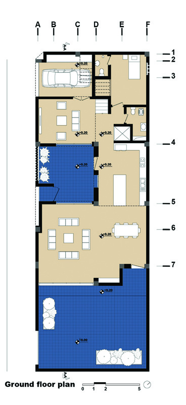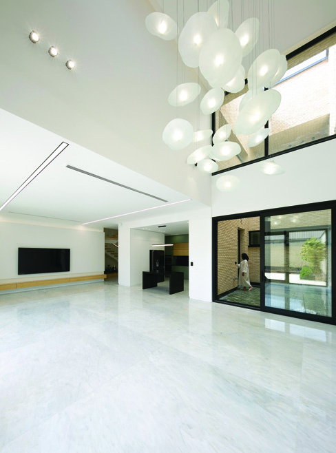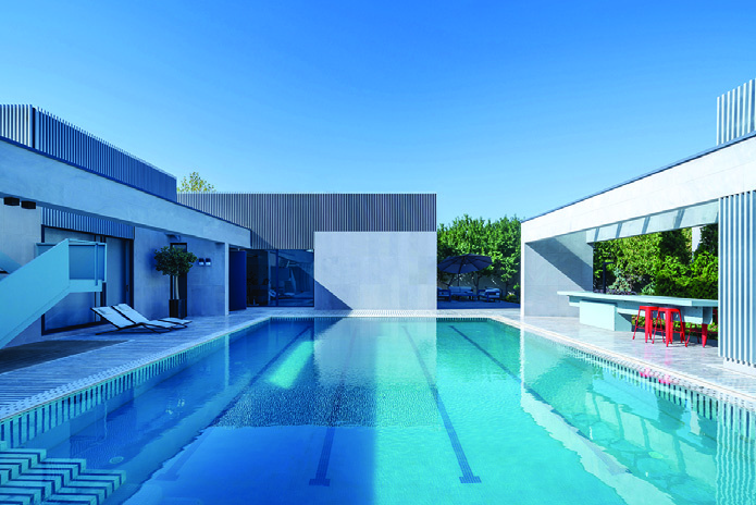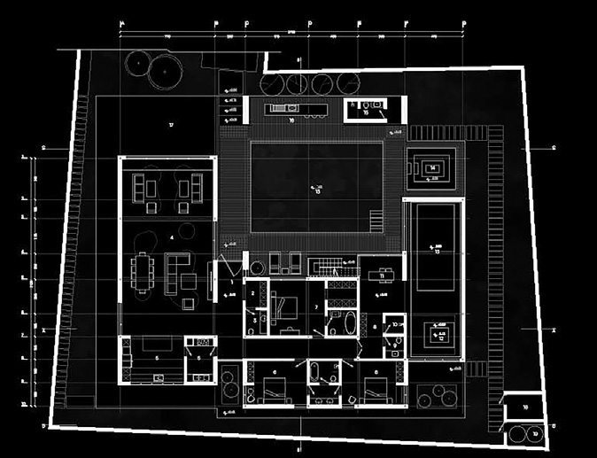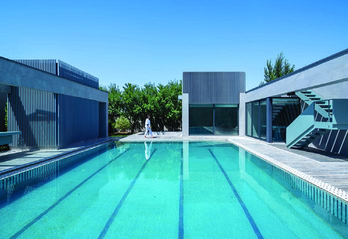 Arranging the villa's mass around the pool created a central courtyard with water at its heart — a cozy, tranquil courtyard yet visually and functionally connected to the surrounding garden. To maintain a human scale and create an intimate atmosphere, the overall height of the volumes was kept as low as possible. The expression of this duality in form and materials is the juxtaposition of low, heavy solid masses alongside tall volumes clad in light, delicate vertical louvers. The extension of the louvers' vertical lines into the courtyard paving and their metaphorical continuation into the pool water formed a symbolic connection from water to sky.