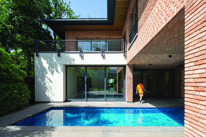 Villa Souran is a response to a commission for designing a leisure retreat, on a plot situated at the end of a villa township alongside agricultural lands. The site, with its distinctive shape, transitioned from a relatively narrow passage to a broad, open expanse. In the middle of this expansive area, a large pool existed that had previously been used for storing agricultural water. Rather than being removed, this defining element was embraced as the focal point and organizing principle of the entire design.