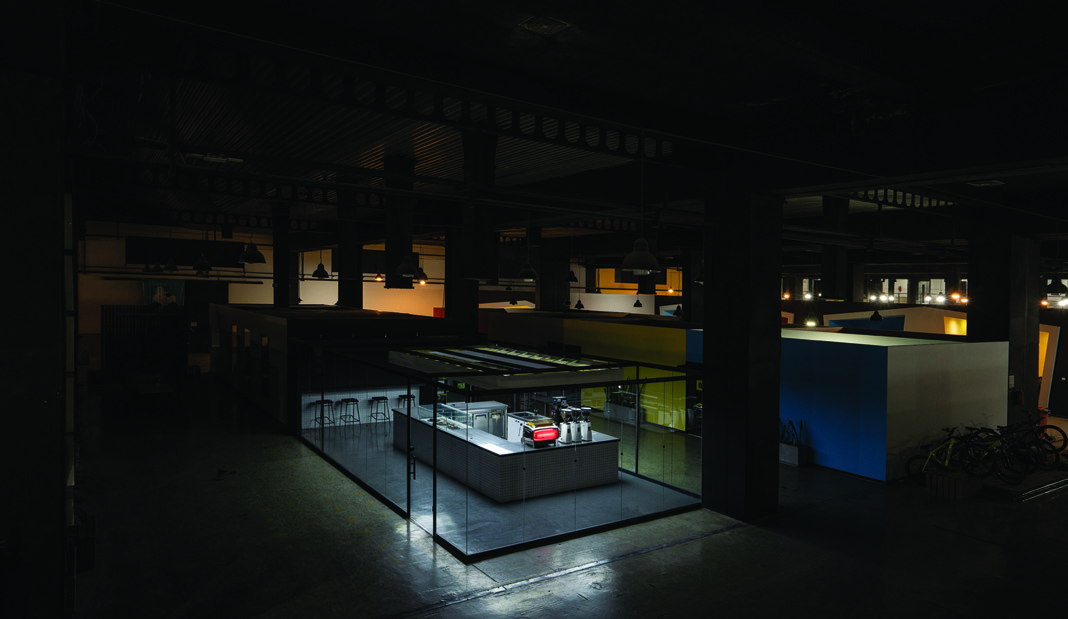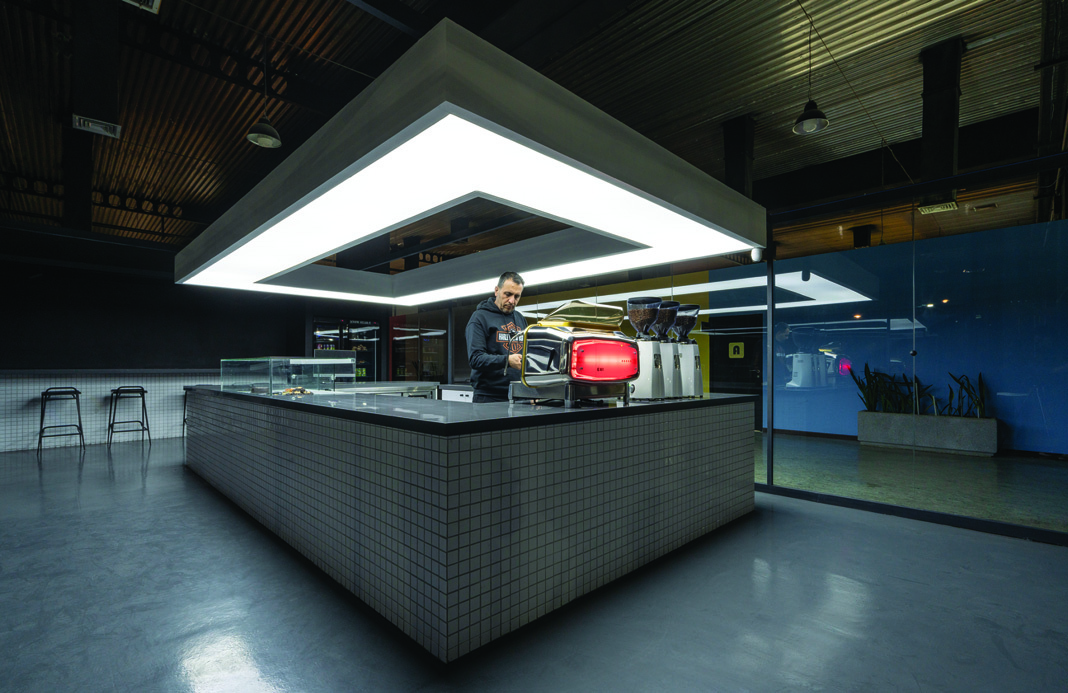 In choosing materials and geometry, we emphasized simplicity, clarity, and function: white tiles with an industrial texture, polished concrete flooring, and an illuminated volume that strengthens spatial legibility along the vertical axis. The luminous cube appears detached from the ceiling and surrounding walls, and by its reflection on the polished floor, seems separated from the ground — an evocative, suspended volume in space. The cafe function at the heart of the cube is designed like a performance stage visible from every angle, where the barista's work process becomes a kind of daily performance.
