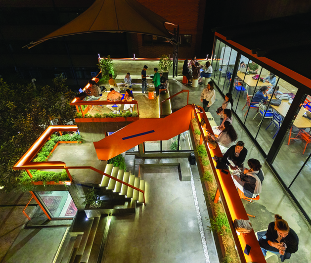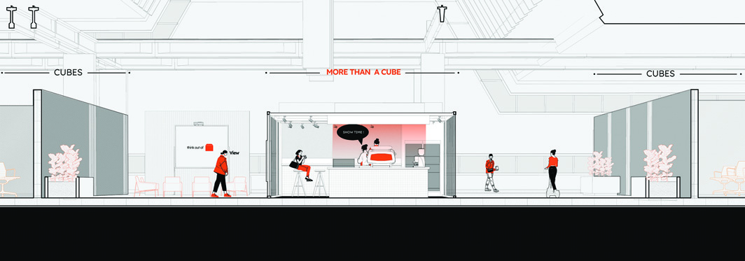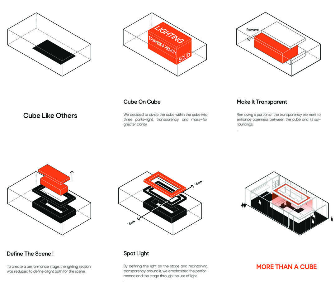 Inside an abandoned industrial factory now converted into an innovation center, this cafe design sought to respond to the young, creative generation's need for a shared, fluid, and inspiring space. Our approach was a critical reading of the existing context. Workspaces allocated to young teams were designed in small dimensions due to economic considerations, turning the wall into a limiting element. In response, we turned to the concept of "wall-lessness" and proposed a fully glazed cubic structure as an antithesis — a physical metaphor for "thinking outside the box."