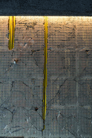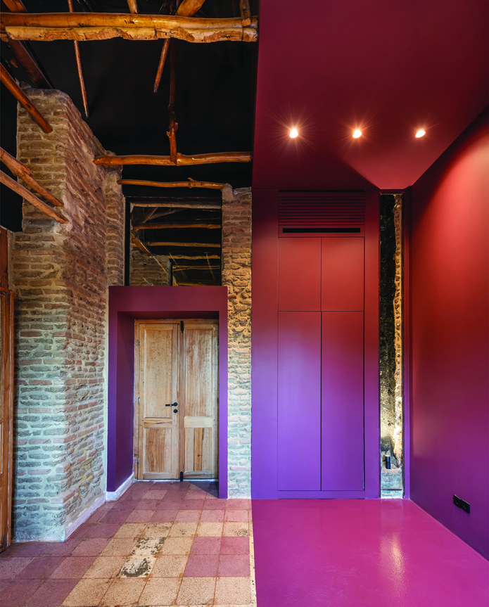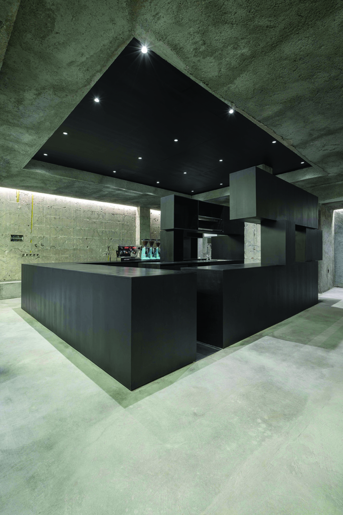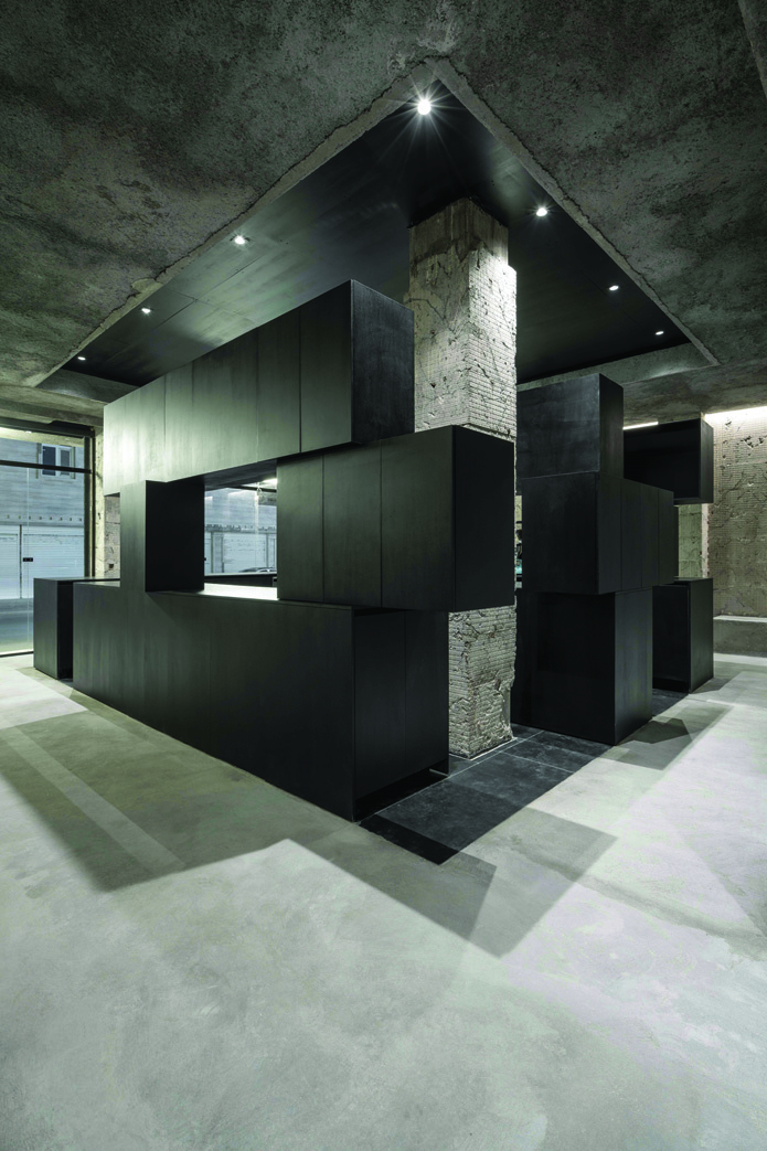 Stripping: by removing the ceramic layer from wall surfaces, the underlying mortar — bearing the imprints of removed tiles — is revealed as the final texture. These intensely accidental, unplanned surfaces, by not adding new materials, maximize cost reduction and increase construction speed while providing a new, unrepeatable textural experience. Adding: the Jambo cabinet takes the form of heavy masses that have slid over one another, creating diverse spaces within and around themselves, divided into three height sections based on workspace standards while maintaining the unusual aesthetic of this dark, heavy element.