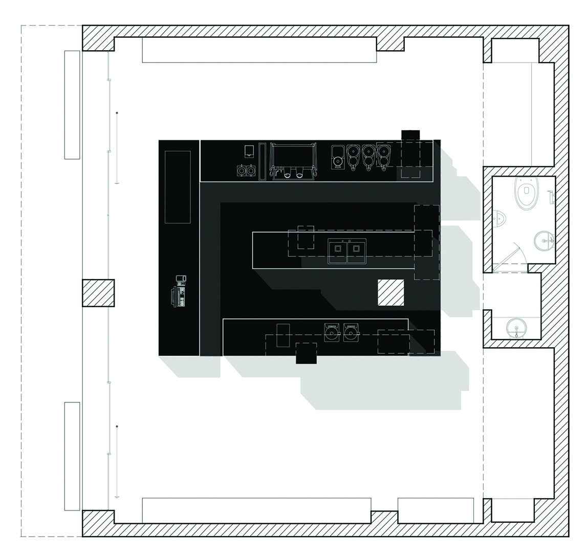 Part of the construction had already been completed and the space was being used as storage, abandoned at the ceramic tiling stage. The rental nature of the space dictated economy and design flexibility. Our main strategy was converting kitchen cabinets — a spatial necessity — into a central addition in the middle of the space. By distancing this element from the surrounding walls, it creates diverse spatial experiences and generates capacity for different operational scenarios.