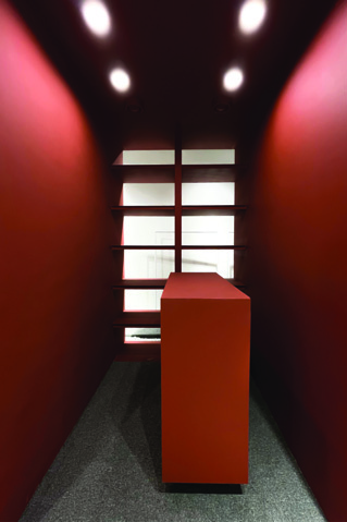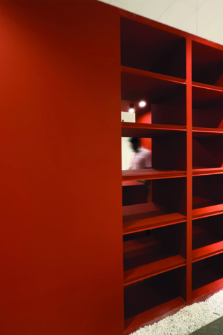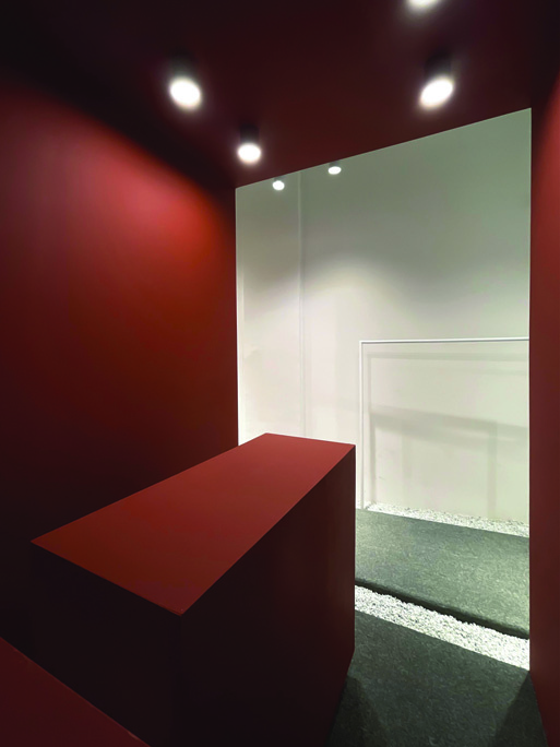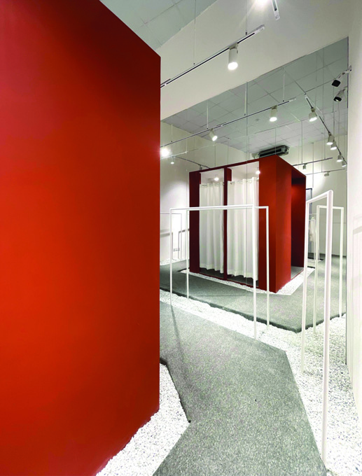 The central red box responds to the visitor's needs from every angle. Everything is gathered in one multifunctional box that houses all activities and micro-spaces, attracting and beckoning the visitor. By maximally eliminating the usual environmental noise found in stores, the aim was to attract the visitor to the path and encourage spatial exploration with minimal material. The entire end surface was covered with mirrors, creating depth, dimension, and extension — a room whose end is unknown, stretching the path and increasing visibility both inside and outside the store.
