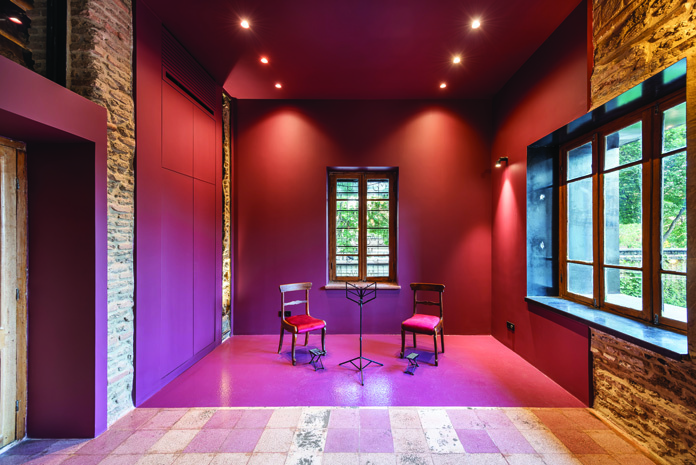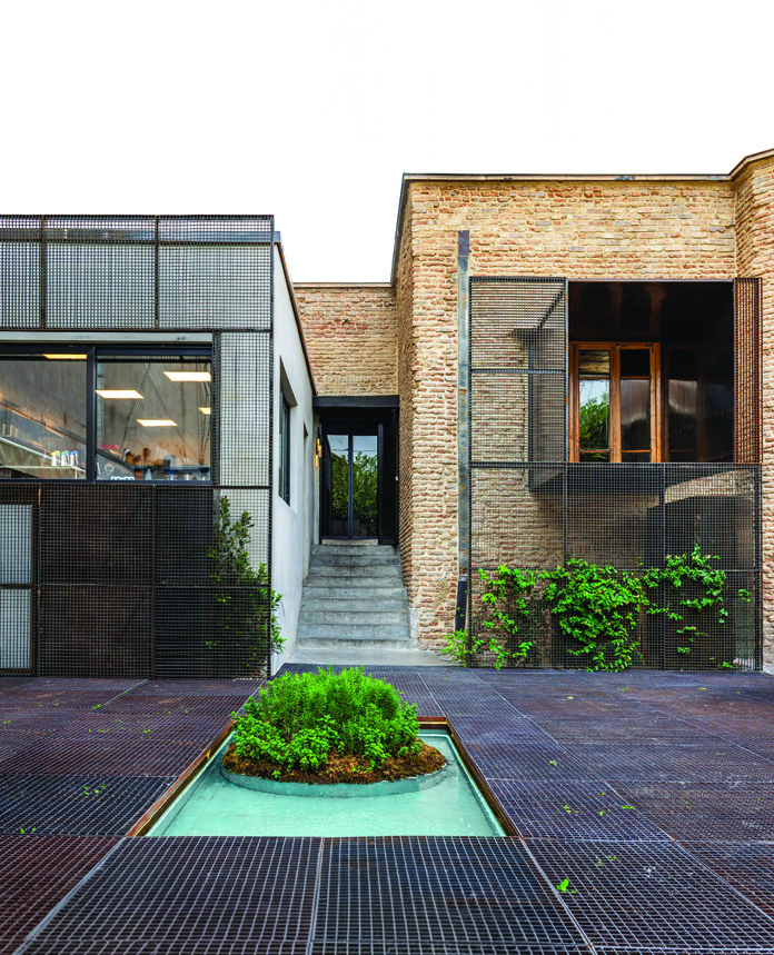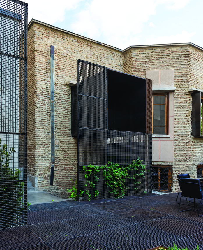 Flowerpots, a pool, and a tree are reminiscent of Iranian house courtyards. In Mansha Mansion's design, these elements are borrowed from the past and reused with a different translation in a modern structure. Another shaping strategy is boundary-setting: maintaining distance between new constructions and the existing building — a form of homage to the past. In the courtyard, a new floor is set above the existing ground level, distanced from the courtyard walls. This added surface is repeated on the facade as well, echoing the strategy of "distance means respect."