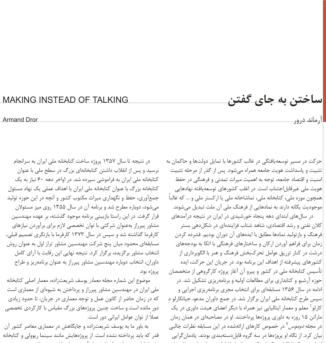 Footnotes: 1 — Giancarlo De Carlo, a graduate in Civil Engineering from the Milan Polytechnic and holding a doctorate in architecture, taught at Italian universities, MIT, and Yale University in America. 2 — "Interview with Giancarlo De Carlo," Domus magazine, No. 585, 1978; translated by Soheila Beski, published in Abadi magazine, No. 17, 1374.