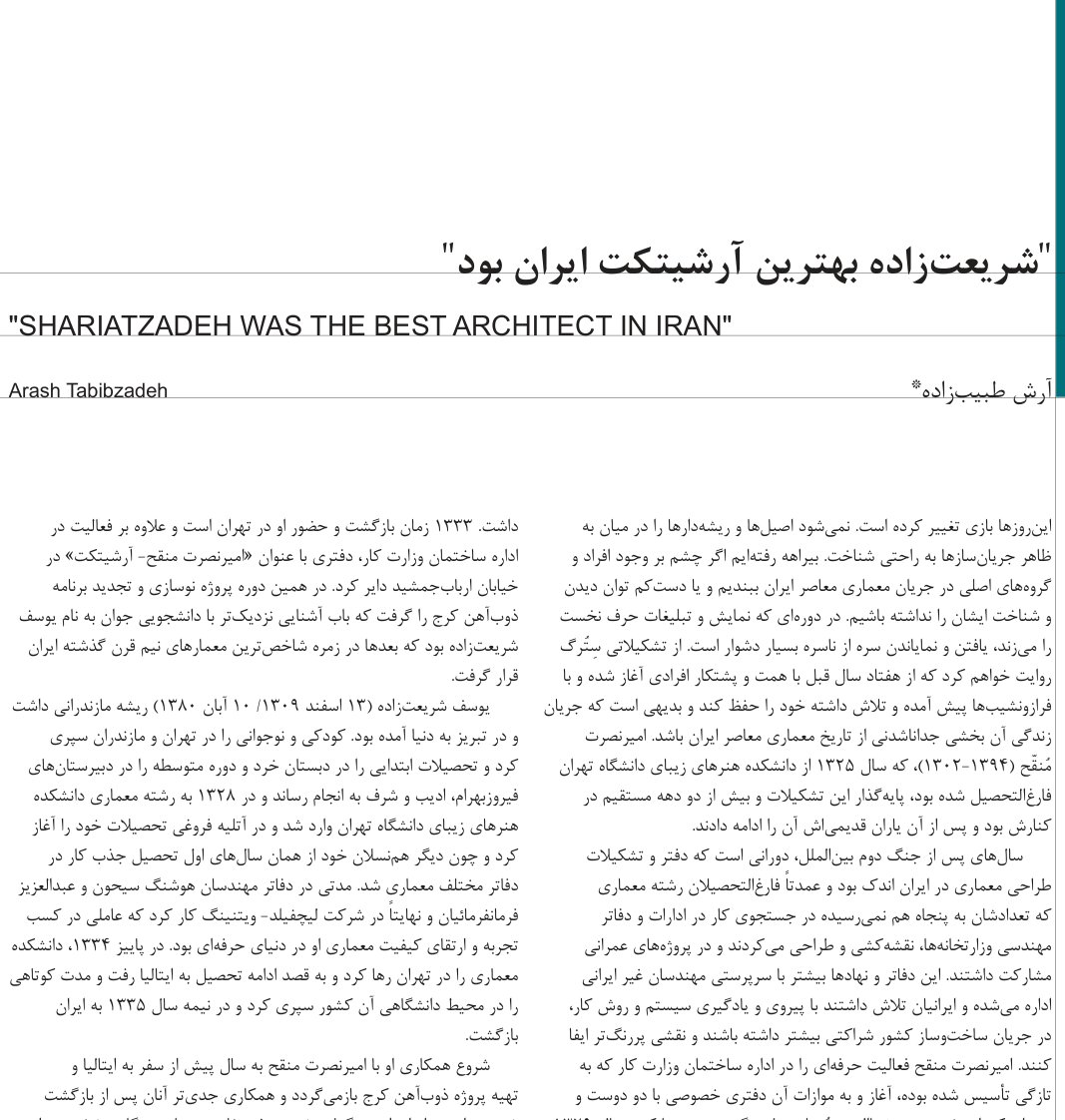 "Shariatzadeh Was the Best Architect in Iran"