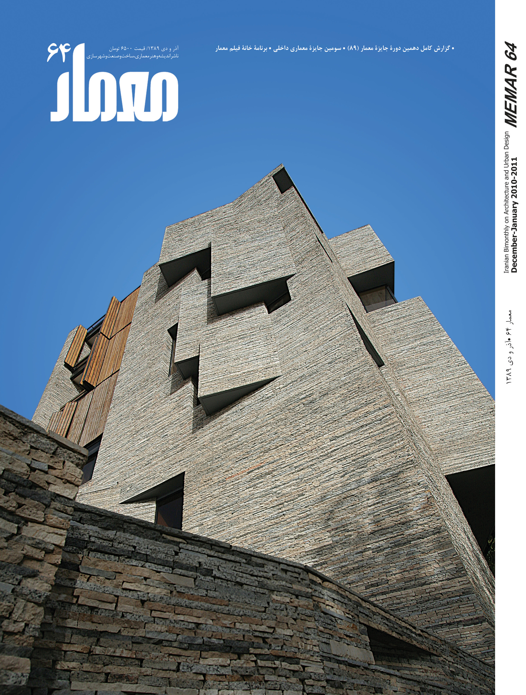 Issue 64 of Memar Magazine covers the 10th Memar Award (2010), judged by an international jury panel of Hadi Teherani, Nader Tehrani, Gisue Hariri, Mojgan Hariri, and Nasrin Seraji. The award recognized outstanding works in both residential and public building categories, with winners ranging from a recycled-stone apartment in Mahallat to a water museum in a historic Shiraz cistern.