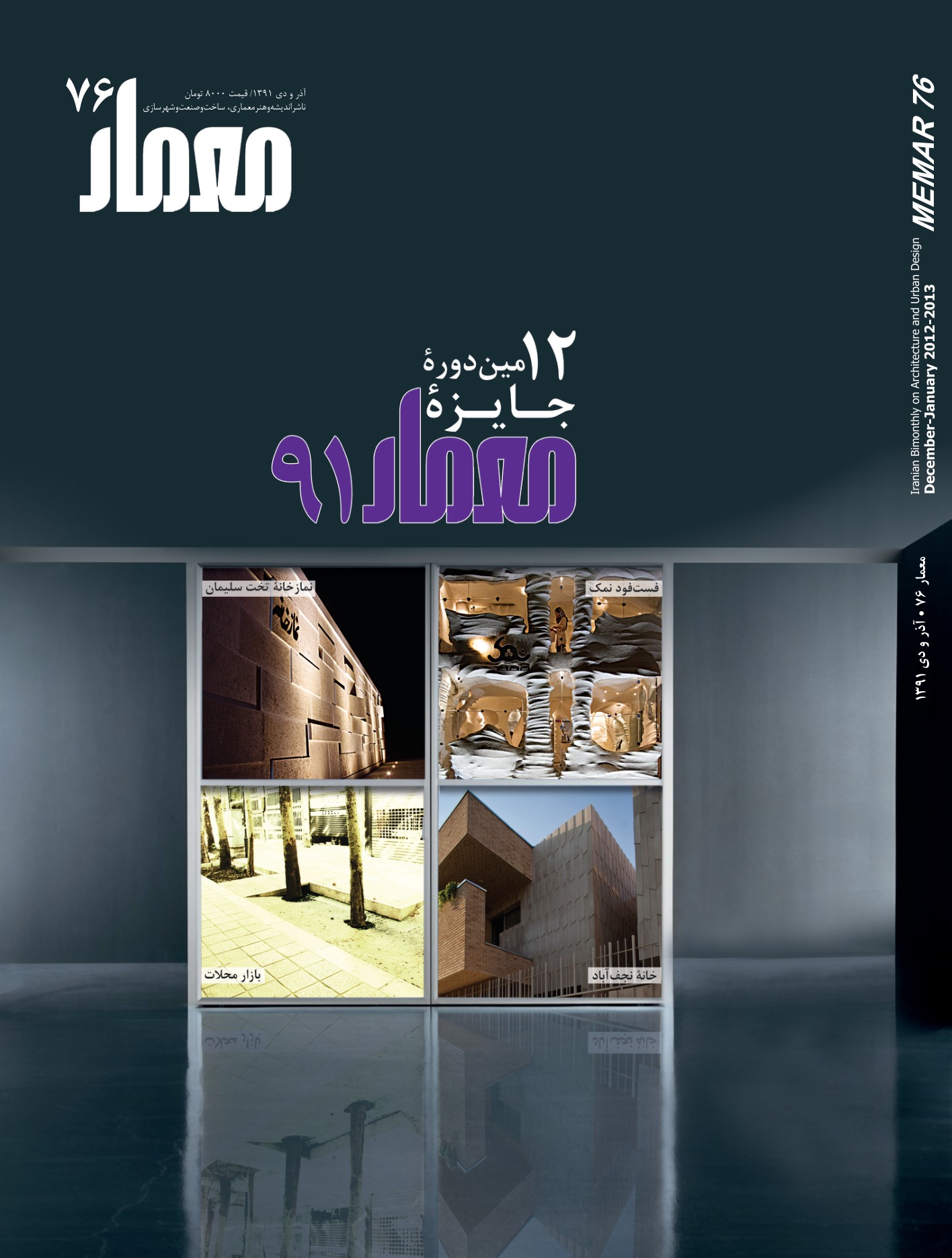 The 12th Memar Award issue features the results of the annual architecture prize covering Residential Buildings, Renovation, and Public Buildings categories. The jury—Faramarz Sharifi, Ali Akbar Saremi, Shamil Mohammadzadeh, Kamran Afshar Naderi, and Armin Daneshgar—reviewed 160 submissions, selecting winners across three categories.
