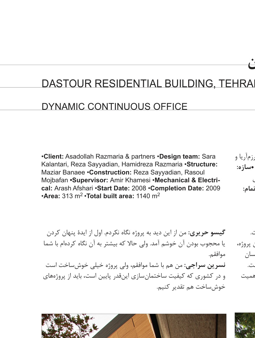 A residential building in Tehran designed by Sara Kalantari, Hamidreza Razm-Aria, and Reza Sayadiyan. Received honourable mention at the 10th Memar Award (2010).